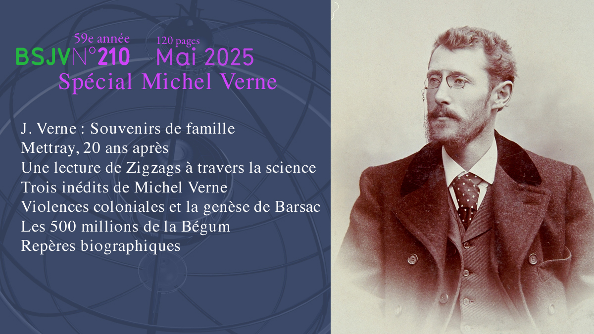 La présente livraison poursuit ce travail. Nous remercions Jean Verne d’avoir bien voulu partager avec nos lecteurs le regard d’un petit-fils sur l’homme complexe qu’était Michel. Jean-Louis Mongin rappelle à cet égard les traces profondes laissées par l’épisode carcéral de Mettray. Tandis que Colette Le Lay pose son regard d’historienne des sciences sur les Zigzags à travers la science, débuts littéraires parrainés par un père très soucieux de l’avenir de son fils, Masataka Ishibashi livre une analyse approfondie de la genèse de L’Étonnante Aventure de la mission Barsac, dernier Voyage extraordinaire aux parentés multiples. Les transcriptions réalisées par Philippe Scheinhardt donnent un accès direct à une écriture juvénile, affranchie des modèles paternels mais inachevée, et l’érudition de Philippe Burgaud et de Jean Demerliac éclaire de nouveaux pans de sa carrière cinématographique. En complément nous publierons dans le prochain Bulletin des lettres adressées par Michel à son cousin germain Raymond Ducrest de Villeneuve dans les toutes dernières années de sa vie.